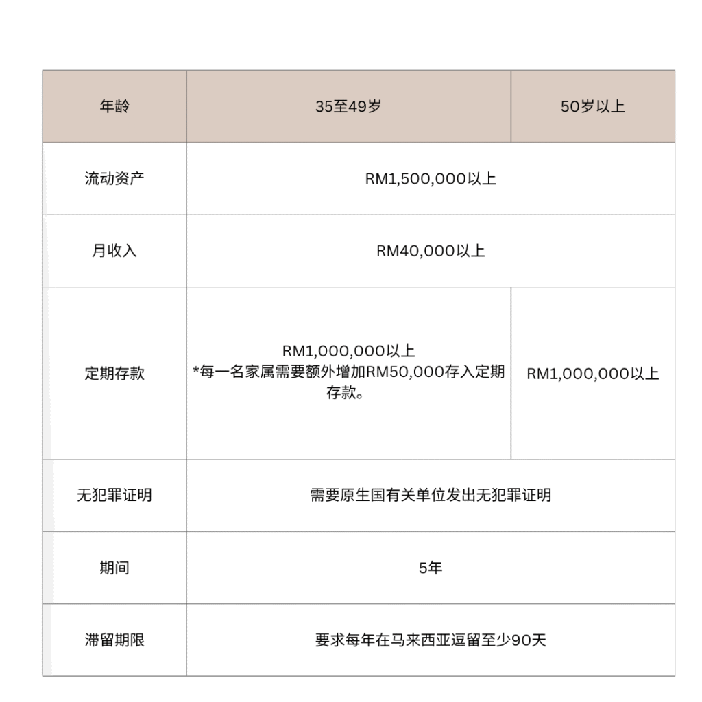 | 滞留期限 | 要求每年在马来西亚逗留至少90天 | |