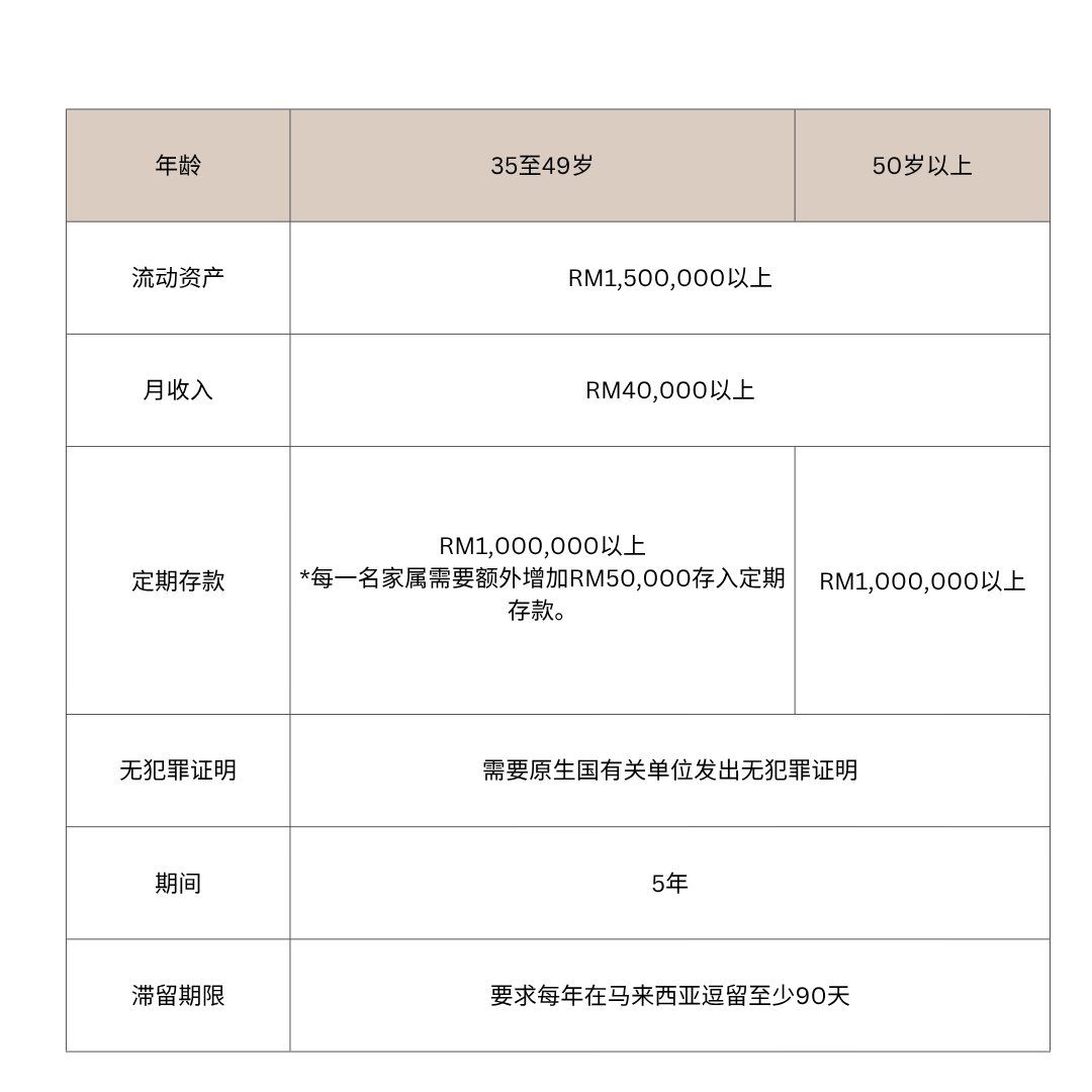 | 定期存款 | RM1,000,000以上 *每一名家属需要额外增加RM50,000存入定期存款。 | RM1,000,000以上 |